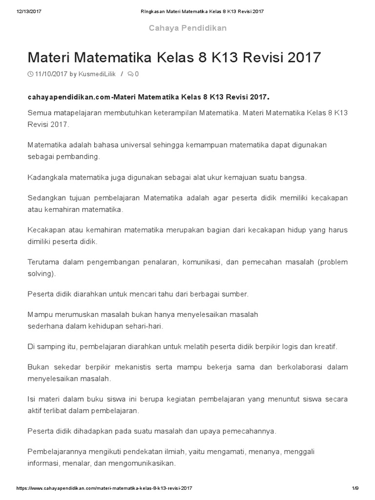 Materi Matematika Kelas 8 Kurikulum 2013 Revisi 2017