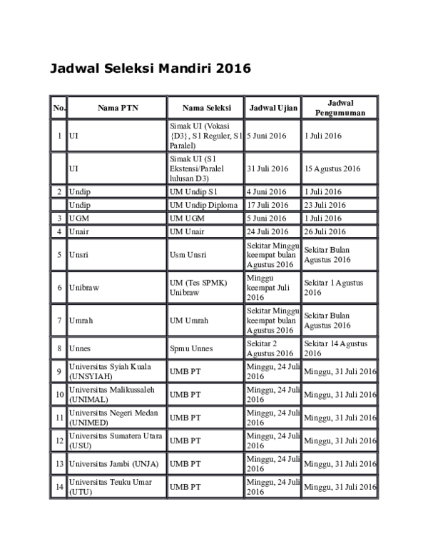 DOC) Jadwal Seleksi Mandiri 2016 | linda waty - Academia.edu