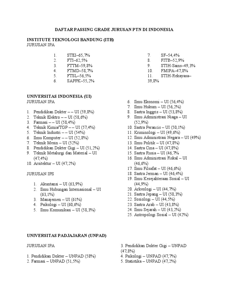 Daftar Passing Grade Jurusan Ptn Di Indonesia