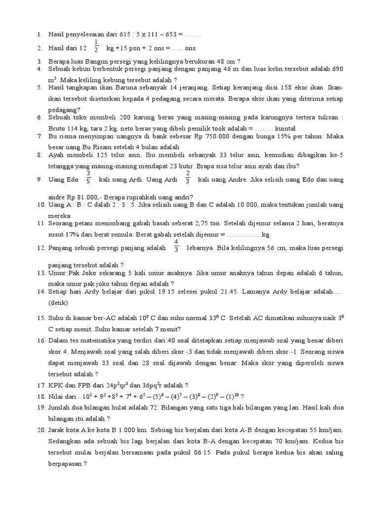 Populer Soal Tes Masuk Smp Matematika Pdf