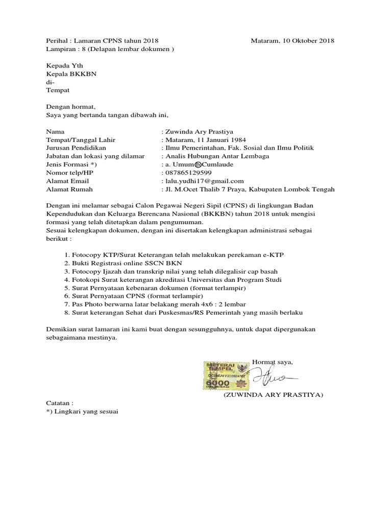 Contoh Surat Pernyataan Cpns Bkn - CONTOH SURAT LAMARAN CPNS